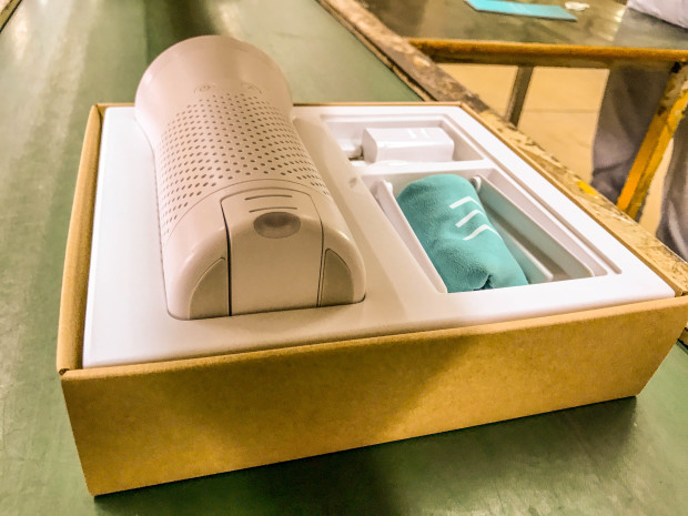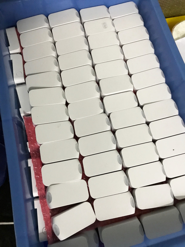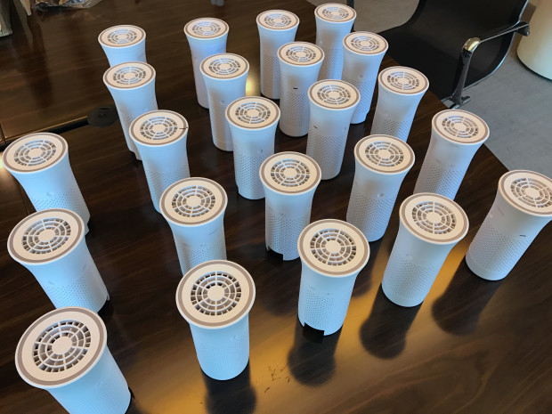 Finished trackers that have already been tested and calibrated. They are each waiting for a Wynd purifier to pair with before final packaging.