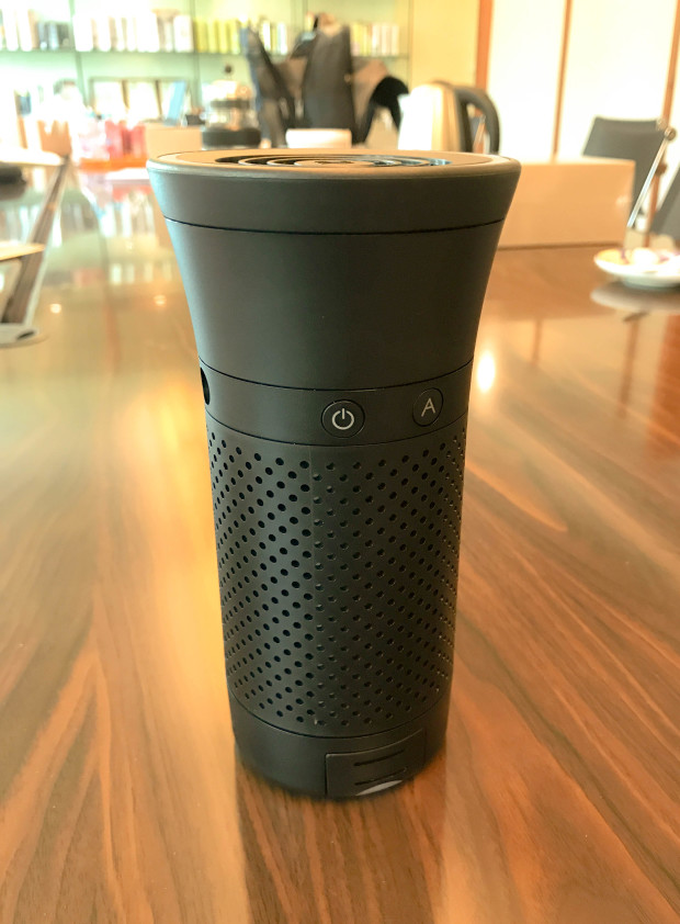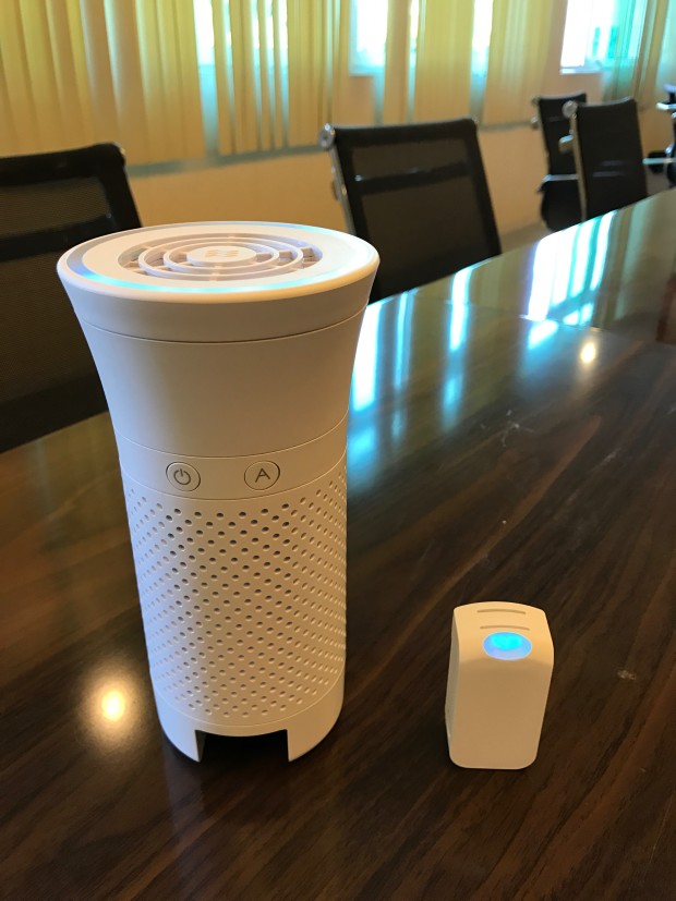 Fully assembled purifier and tracker next to each other. You can see both of them are on and the lights are showing the airflow and air quality levels, respectively.