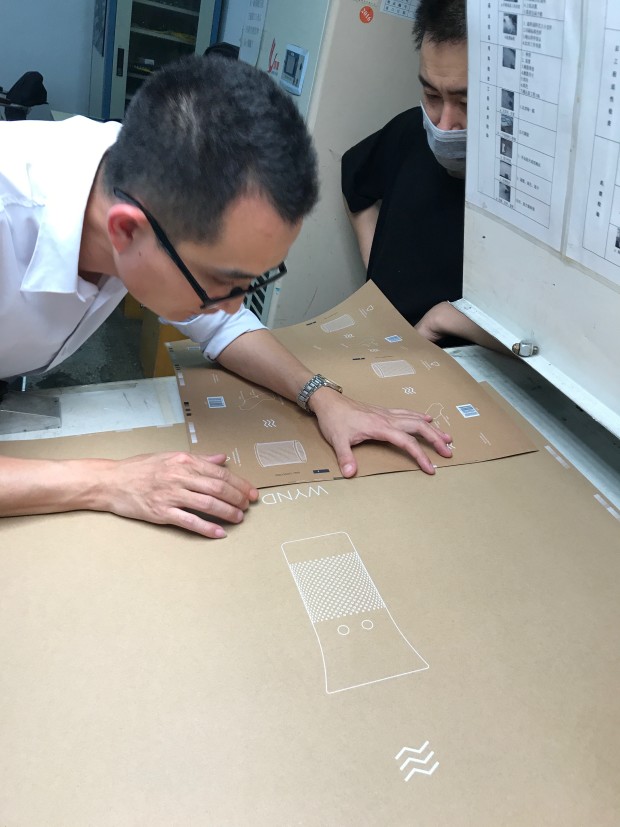 Inspection of the packaging template. This artwork paper is glued onto fluted cardboard. We tried to keep the artwork design (and the packaging in general) simple.