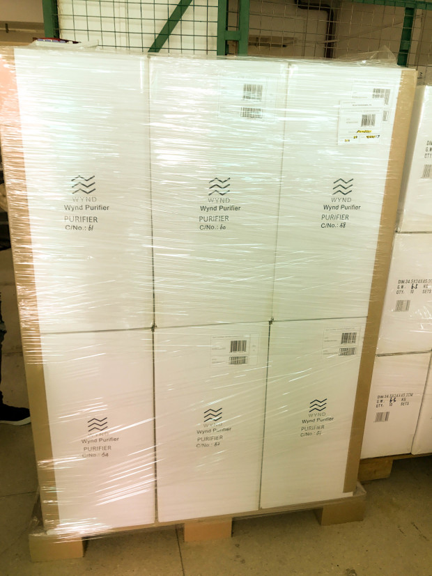 A fully loaded pallet of Wynd purifiers ready to be loaded into a truck for shipping